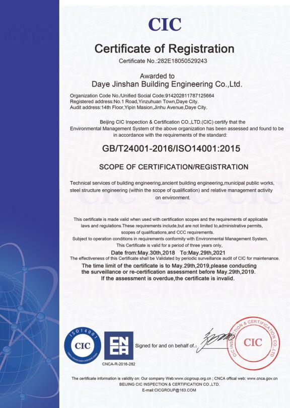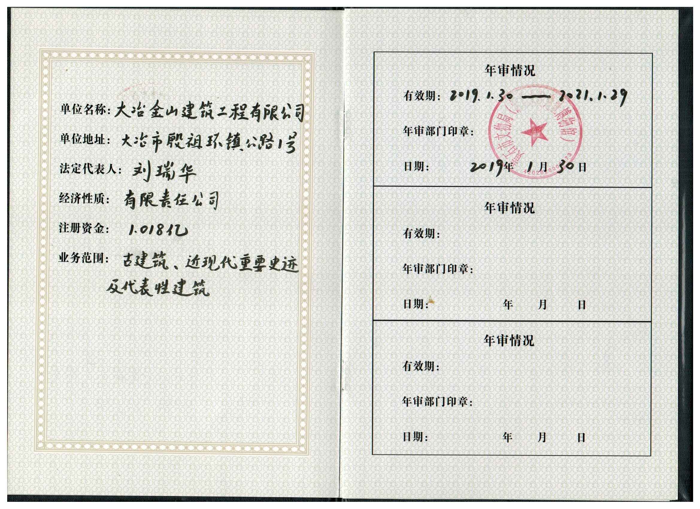 大冶金山建筑工程有限公司始建于1984年,屬鎮(zhèn)辦集體企業(yè)。1997年改制為大冶山建筑工程有限責(zé)任公司,屬股份制企業(yè)。2013年更名為大冶金山建筑工程有限公司,2018年3月公司資源重組,公司注冊(cè)資金達(dá)到10180.00萬(wàn)元,公司法定代表人為劉瑞華。公司具有古建筑工程專業(yè)承包壹級(jí)、建筑工程施工總承包貳級(jí)、市政工程總承包叁級(jí)、鋼結(jié)構(gòu)工程專業(yè)承包叁級(jí)資質(zhì)。